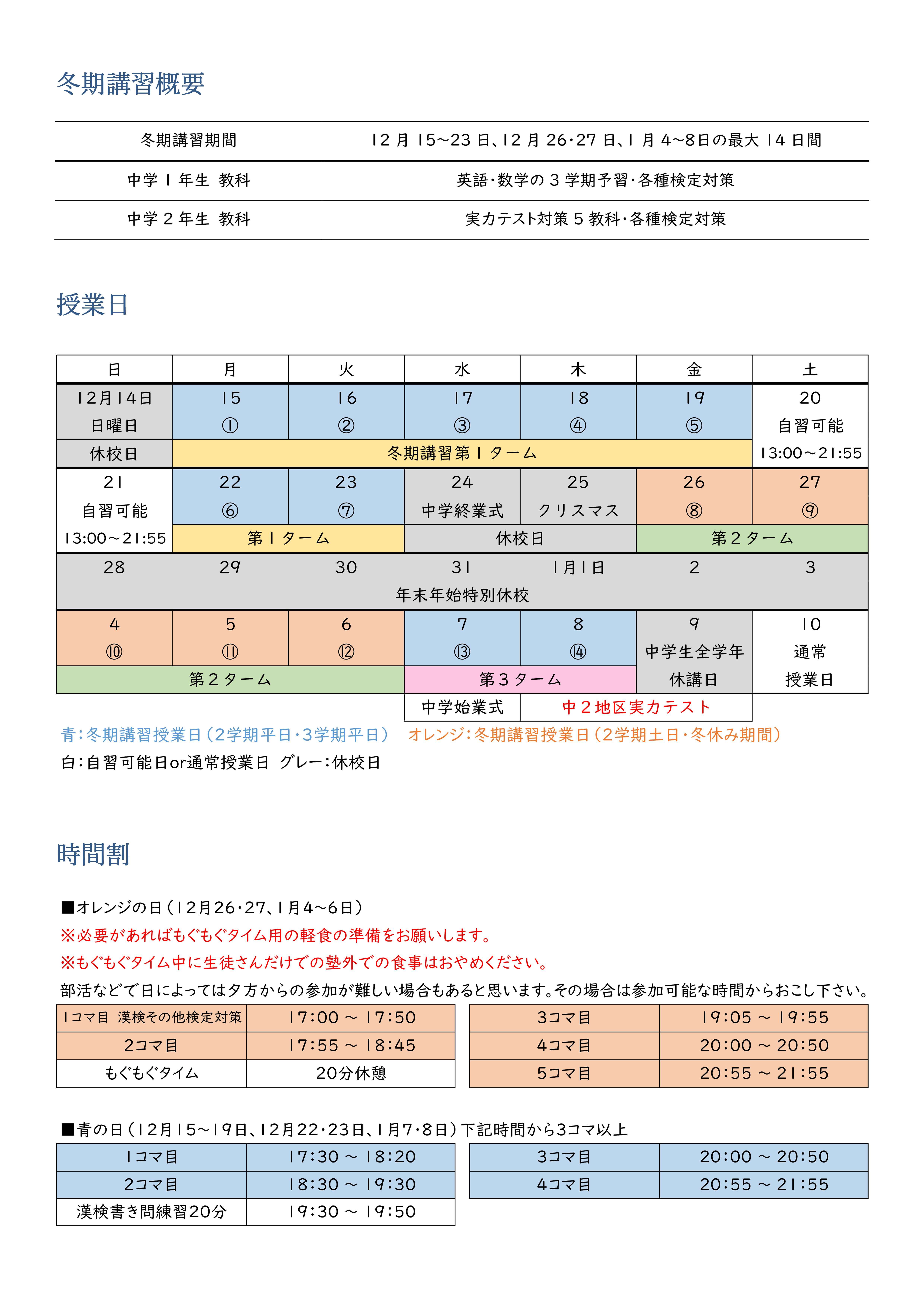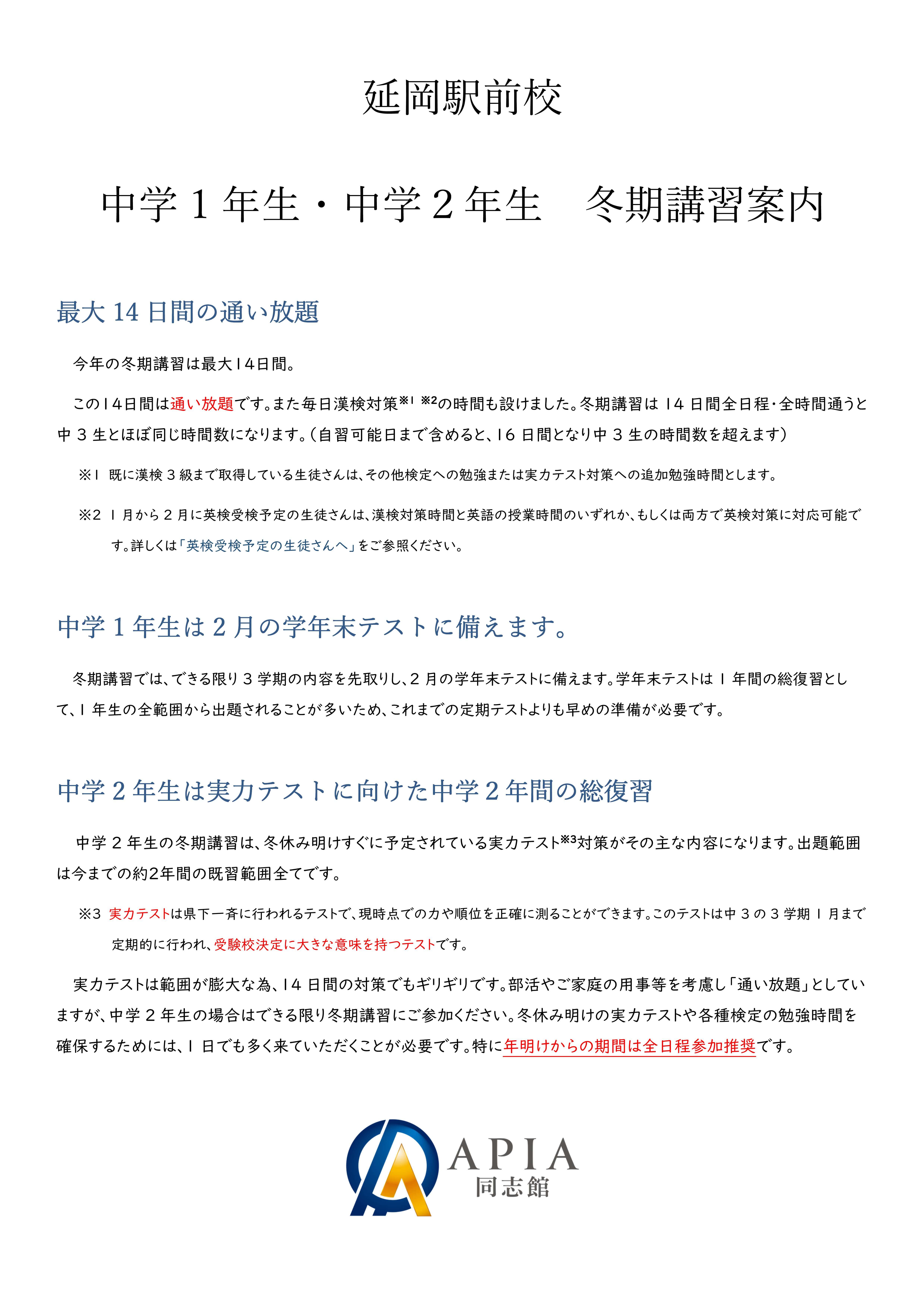 延岡駅前校 中1中2冬期講習案内